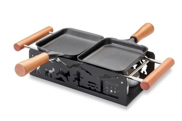 Käseschmelzer für 1–2 Personen. Thermolackierter Stahl. Sichere Heizleistung durch Direkthitze auf Pfännchenboden. Geliefert mit 2 Pfännchen und 2 Spachtel.